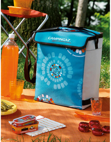 Összehajtható hűtőtáska, állítható válpánttal. Űrtartalom 19 liter,  befogadó képessége 6x1,5 literes palack,  hűtő hatása 12 h 40 perc, Campingaz Freez Pack jégakkuval, súlya 550 g.