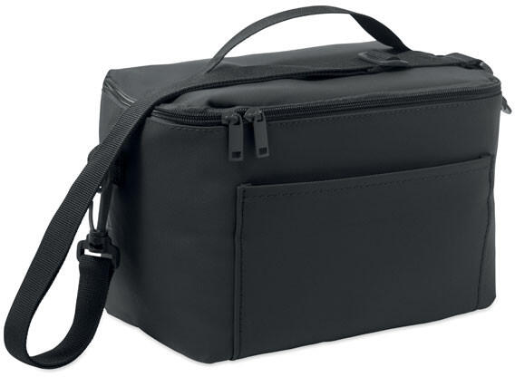 Hűtőtáska PU anyagból, 100 g RPET poliészter béléssel. Elülső zsebbel, fogantyúval és vállpánttal. PE hab és PEVA szigetelés. Űrtartalom: 5,5 l.