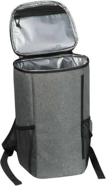 Hűtőtáska funkcióval rendelkező poliészter hátizsák, párnázott vállpántokkal, hálós oldalsó rekeszekkel és belül kis cipzáros zsebbel.