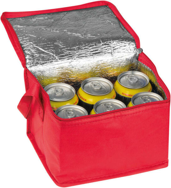 Hűtőtáska nemszőtt anyagból, hordozó szíjjal. Alkalmas 6 db 0,33L-es üdítős doboz tárolására.