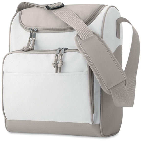 Hűtőtáska elülső zsebbel. 600D poliészter anyagból. Szigetelő anyag: alumínium fólia. Űrtartalom 13 l.