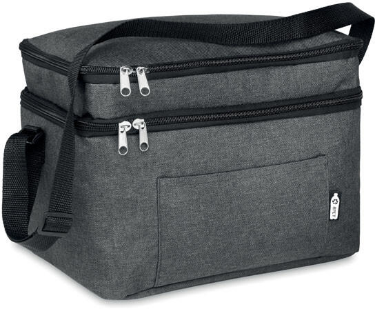 Melírozott színű, 600D RPET kétemeletes hűtőtáska, állítható vállpánttal, első zsebbel.