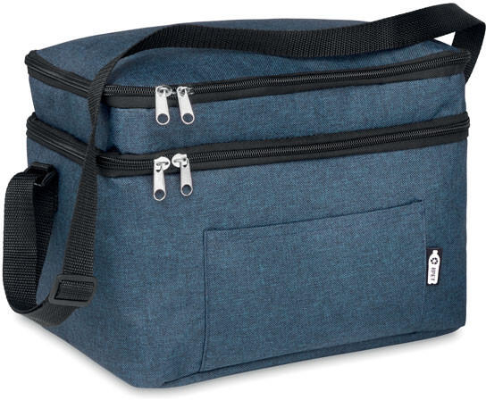 Melírozott színű, 600D RPET kétemeletes hűtőtáska, állítható vállpánttal, első zsebbel. Szigetelő anyag: 0.15mm PEVA + 3mm habszivacs.