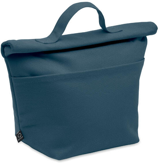 Újrahasznosított kevertszálas (70% újrahasznosított pamut, 30% újrahasznosított poliészter) hőszigetelt uzsonnás táska, roll top csavart, tépőzáras záródással. Szigetelés: 3 mm-es PE hab 12C PEVA-val.