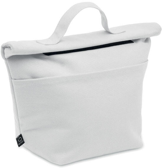Újrahasznosított kevertszálas (70% újrahasznosított pamut, 30% újrahasznosított poliészter) hőszigetelt uzsonnás táska, roll top csavart, tépőzáras záródással. Szigetelés: 3 mm-es PE hab 12C PEVA-val.