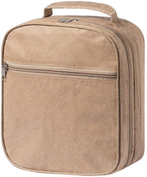 Cipzáras, laminált újrahasznosított papír hűtőtáska alumínium béléssel és elülső zsebbel.