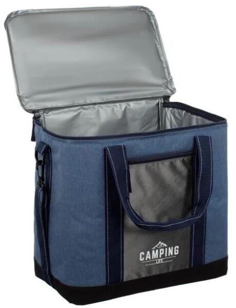 Izoterm táska, 26L, 40x24x28cm, antracit kék Kék farmer és antracit izoterm táska Camping Life nyomtatással. Kívülről műanyag bevonatú anyagból készült a gyors és könnyű tisztítás érdekében, belülről pedig alumínium béléssel, amely segít az ételek hőmérsékletének megtartásában. Körbecipzározható, és a fogantyújánál fogva könnyen hordozható. Specifikációk:Szín Kék antracitTermék anyaga Szintetikus anyagHosszúság x szélesség x magasság 40x24x28cmKapacitás (L) 26
